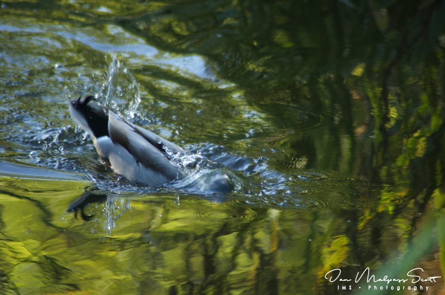 A mallard duck diving in the pond at Northumberland Park, North Shields.