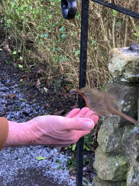 Feeding the robins in Northumberland Park, North Shields
