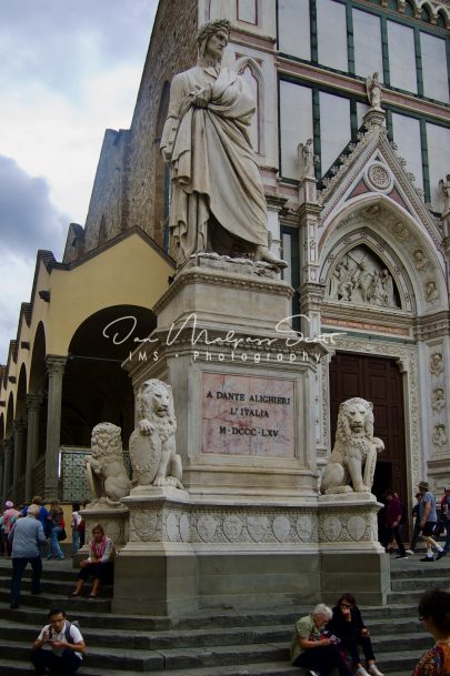The pedestal has four Marzocco lions with shields holding the names of minor Dante works and the symbols of various Italian cities who contributed to the cost of the sculpture.